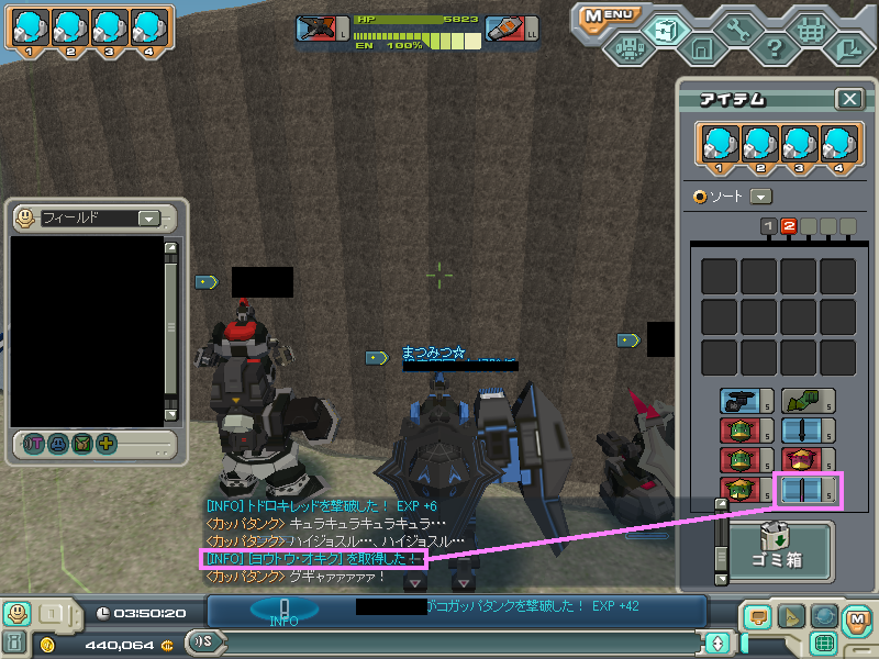 でも、ほぼ体力満タンロボを一機大破状態からのリスタートなので、少々気分が凹んでおります。。。リペア少ないし、ブチャフィールドに戻りキングブチャBSを持ち帰ろうか、それともカッパワールドに留まり何か漁ろうか考え中でーす。